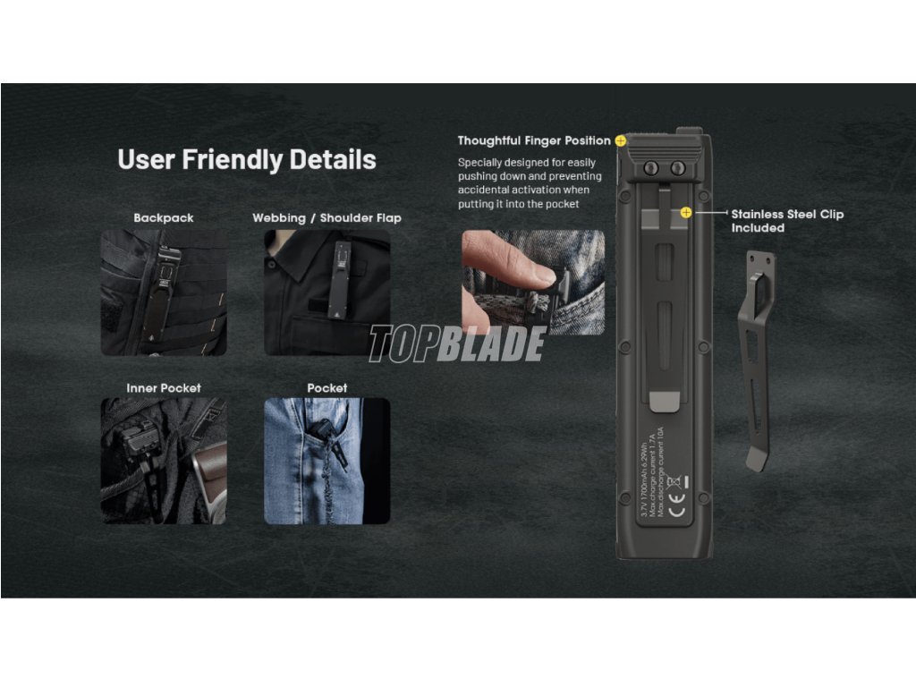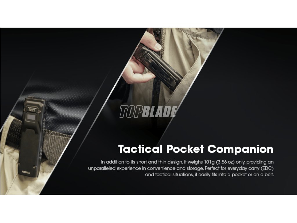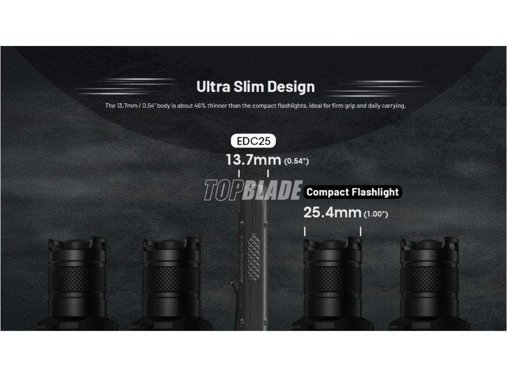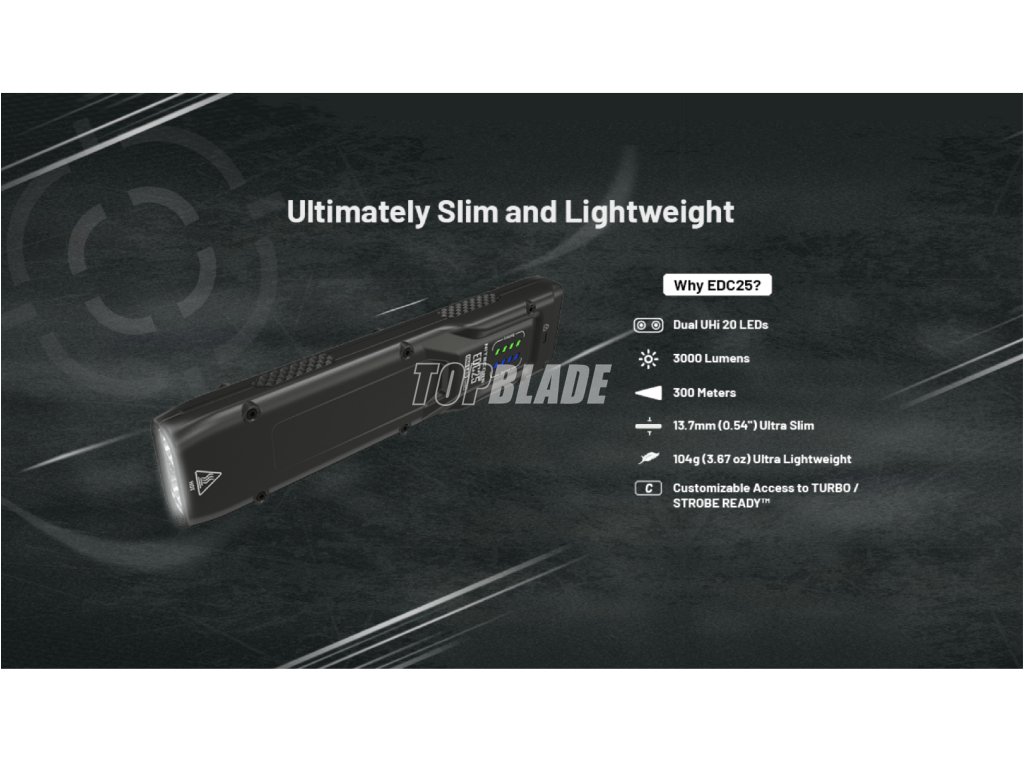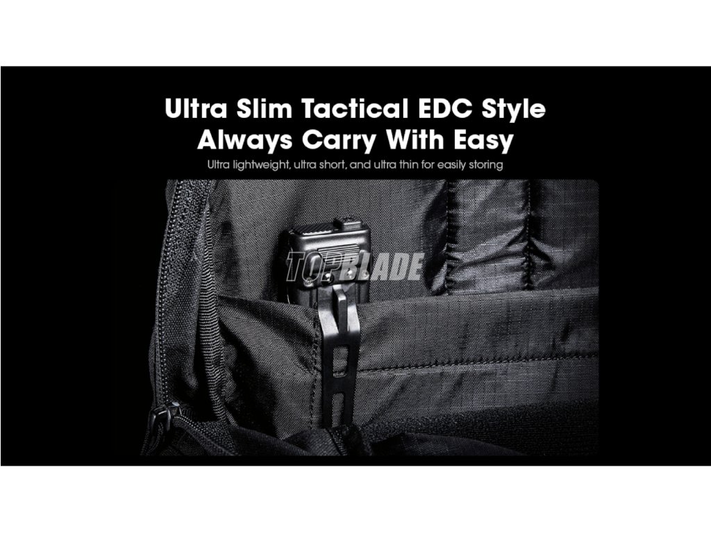 Die EDC25 von Nitecore besticht durch Kreativität und Innovation. Das ultraflache zweiteilige Aluminium-Gehäuse und der Rahmen aus faserverstärktem Kunststoff sorgen für Robustheit und optimierte Wärmeableitung. Die Nitecore EDC25 bietet eine maximale Leistung von 3000 Lumen und eine Reichweite von bis zu 300 Metern. Die beiden LED-Anzeigen ermöglichen es dir, den Akkustand und die aktuelle Leuchtstufe leicht abzulesen. Mit den zwei Lock-Out Modi und dem praktischen Design der Endkappe kann ein versehentliches Einschalten vermieden werden. Der im Lieferumfang befindliche Clip fixiert die Leuchte an der Hosentasche.