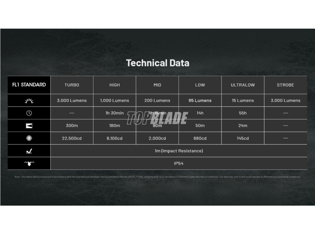 - Turbo*: 3000 lm|- h|300 m|22500 cd