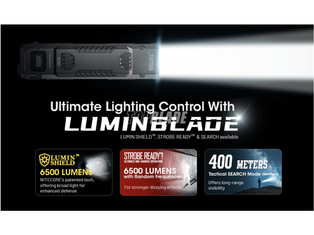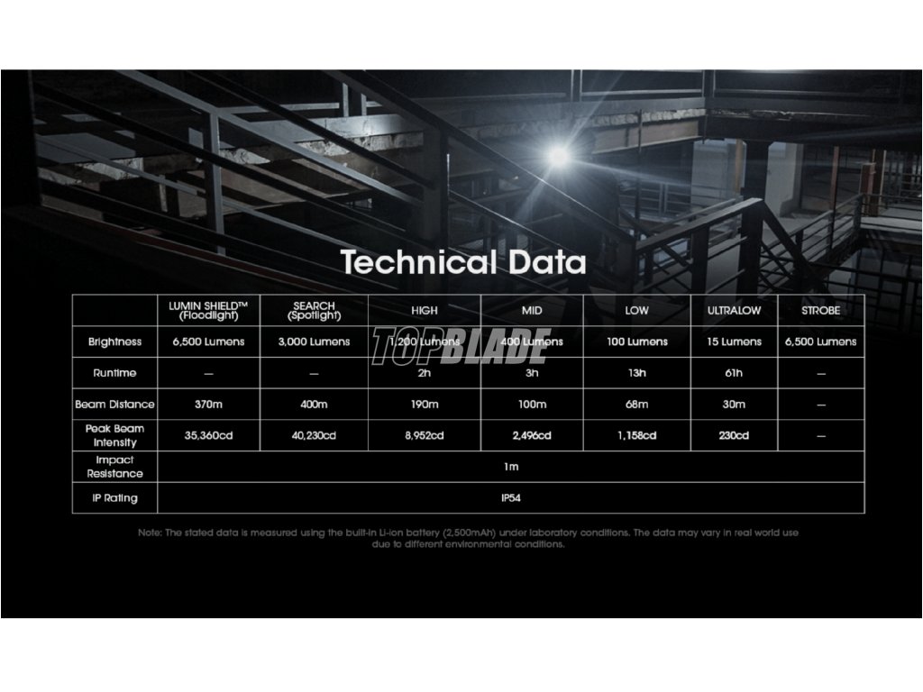 - Lumin Shield (Flutlicht): 6500 lm|- h|370 m|35360 cd