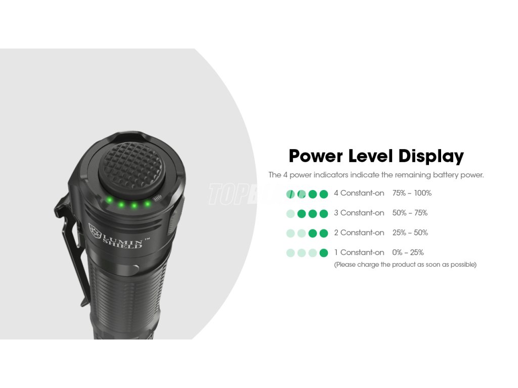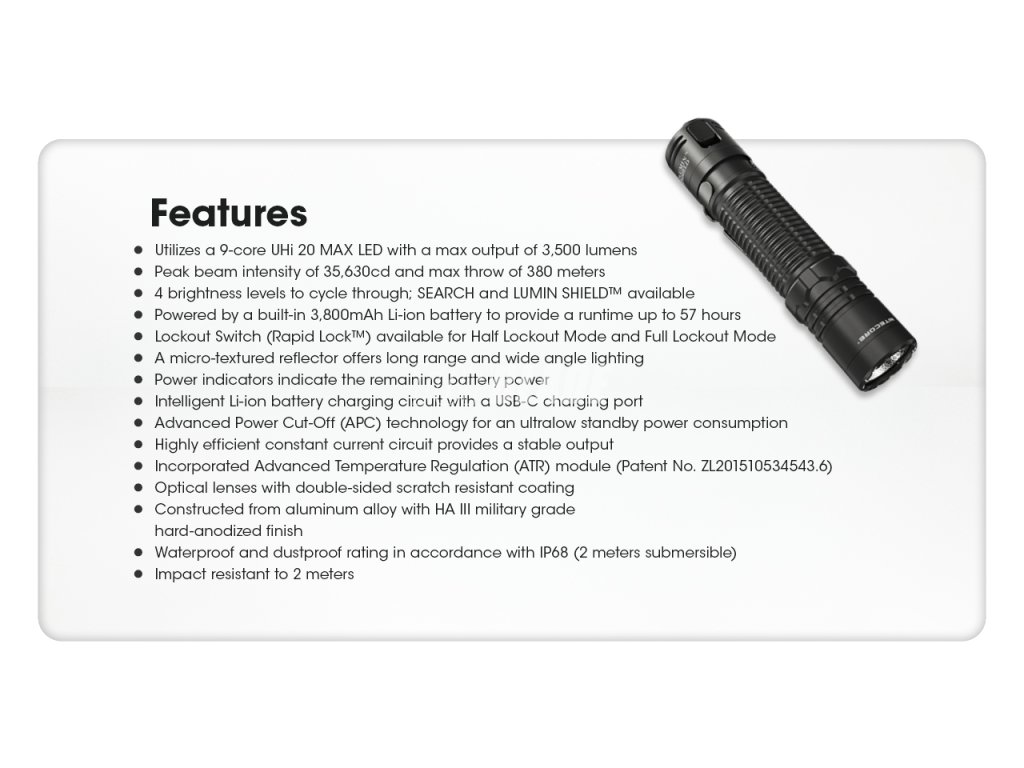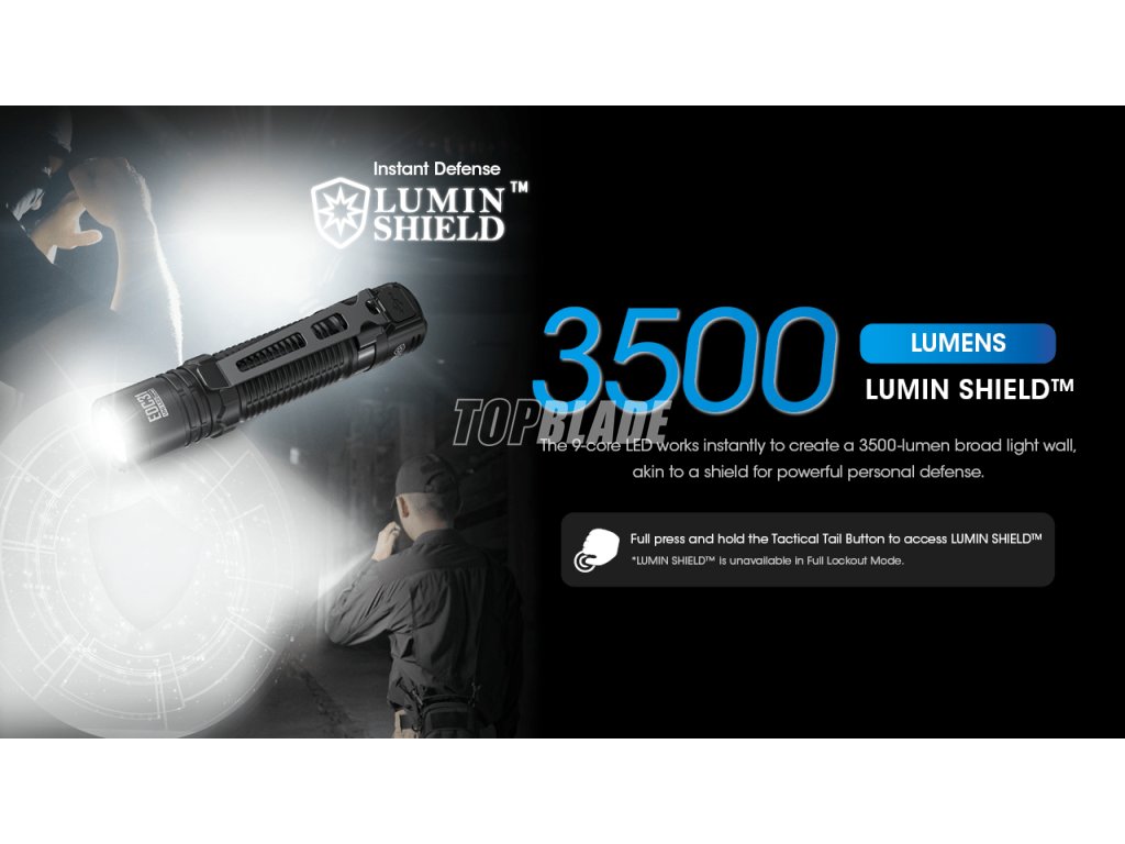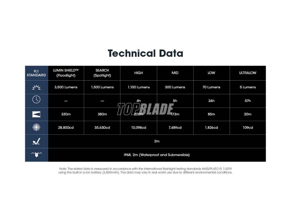 - Floodlight-Modus (LUMIN SHIELD): 3500 Lumen, 330 Meter