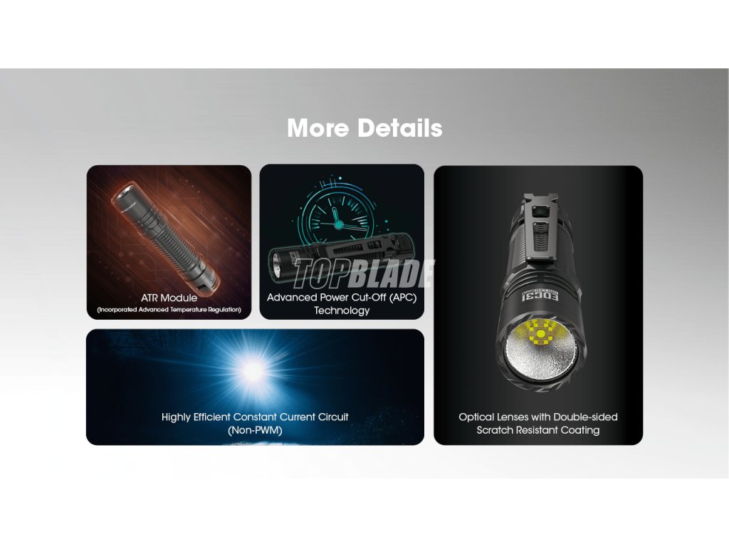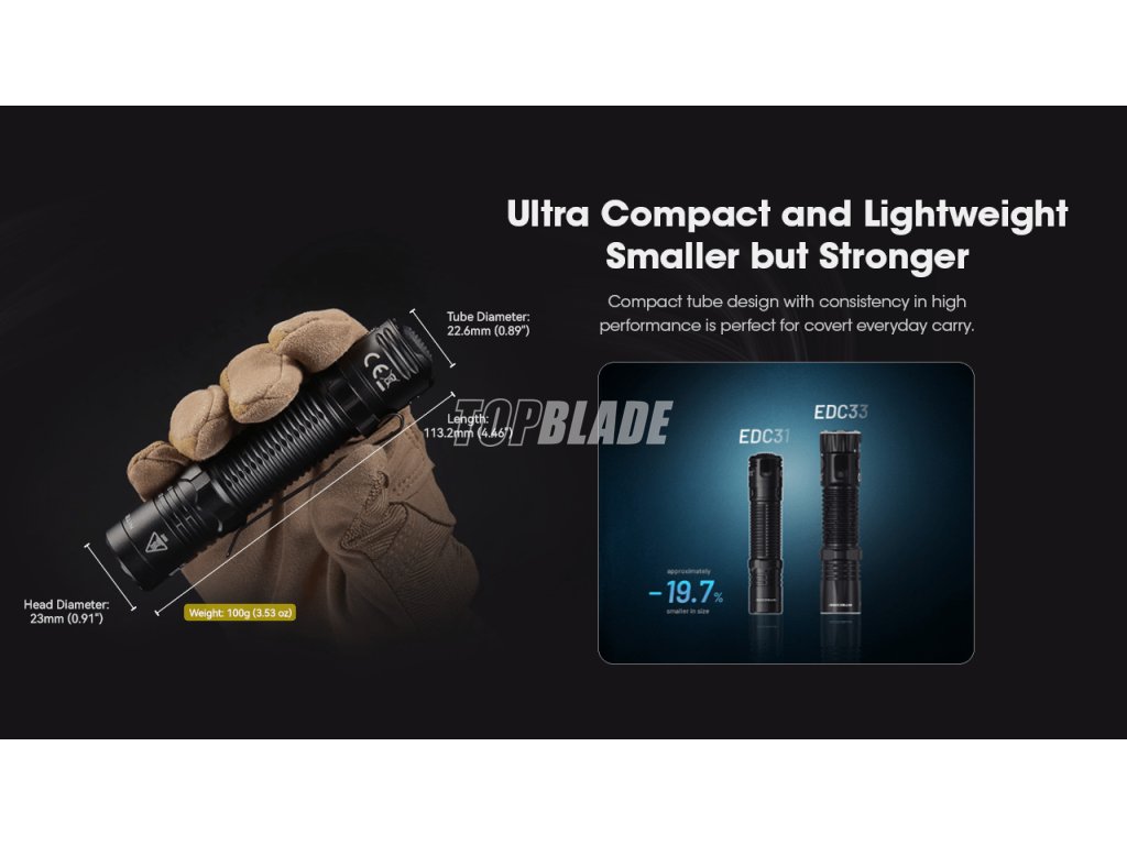 Die Nitecore EDC31 ist ein kompaktes Kraftpaket. Die EDC31 wurde für alle entwickelt, die maximale Lichtleistung in einer Taschenlampe suchen, die man einfach in der Tasche tragen kann. Mit einer Lichtleistung von 3.500 Lumen und einer Reichweite von 380 Metern ist dies eine ernstzunehmende Lampe für den täglichen Gebrauch, Outdoor-Abenteuer oder professionelle taktische Einsätze. Die EDC31 zeichnet sich durch ihre Einfachheit aus: Die Lampe ist mit einer Hand zu bedienen, blitzschnell zu aktivieren und verfügt über praktische Sperrmodi.
