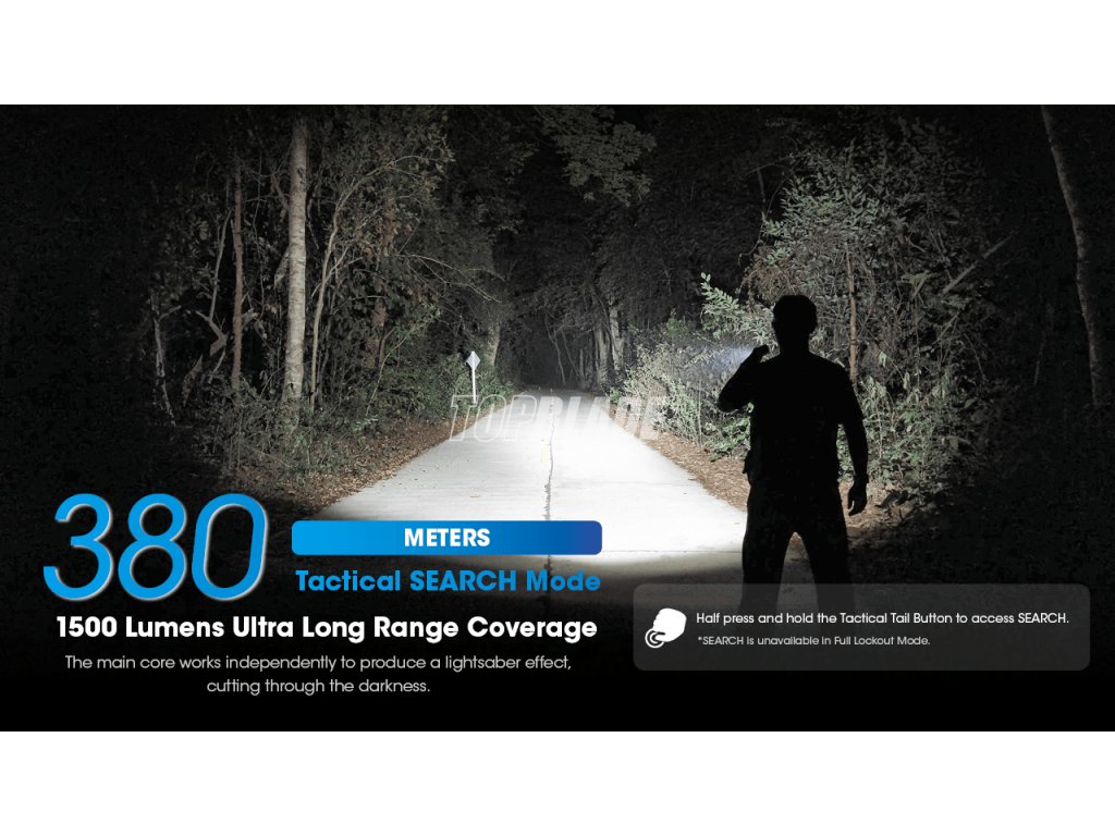 - Spotlight-Modus (SEARCH): 1500 Lumen, 380 Meter