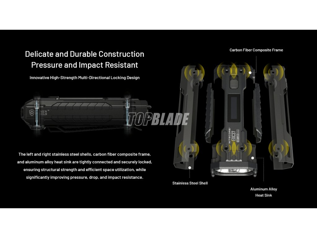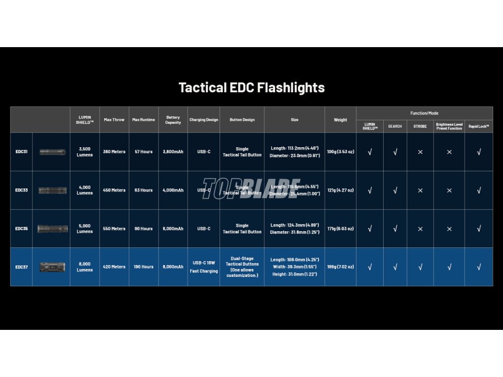 Die Nitecore EDC37 Ultimate Tactical ist die taktische Taschenlampe des Jahres 2025. Mit einer überraschenden Lichtstärke von 8000 Lumen, einer Reichweite von 420 Metern und einem integrierten, leistungsstarken Akku mit 8000 mAh, bist Du auf alles vorberietet. Mit intelligenten Tasten für blitzschnelle Bedienung, einer praktischen Sperrfunktion und einem festen Griff, ist dies die ultimative EDC Taschenlampe für Deinen Alltag. Sein hitzebeständiges Gehäuse und die Glasbrecher aus Siliziumnitridkeramik machen sie zu einer äußerst nützlichen Lampe für Notfälle.