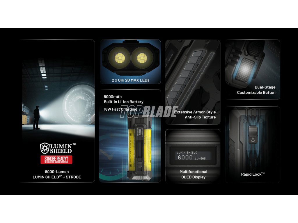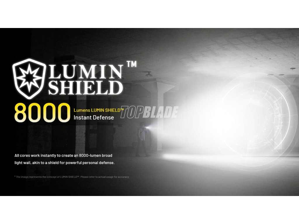 - LUMIN SHIELD™ (8000 Lumen, 380 Meter, kurze Dauer, 37.550 cd Lichtstärke)