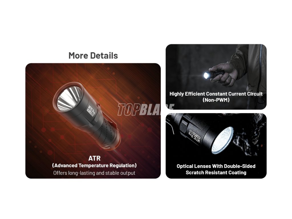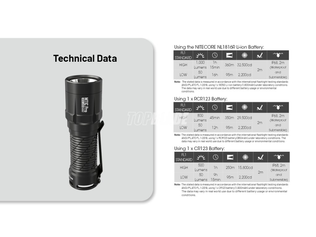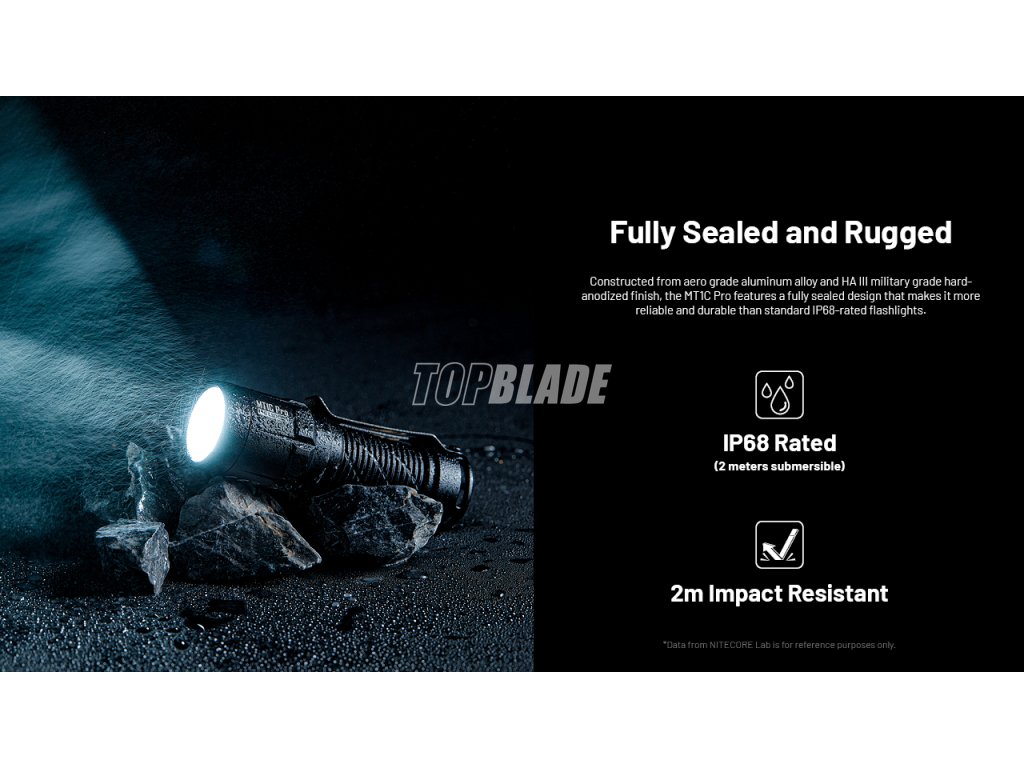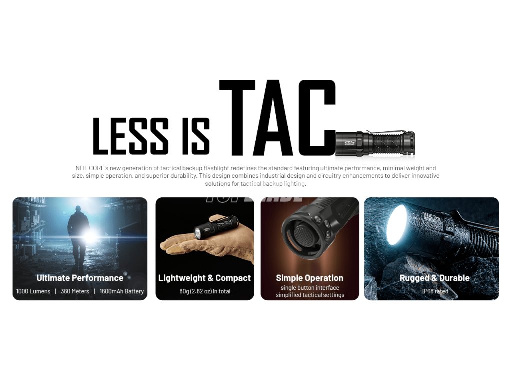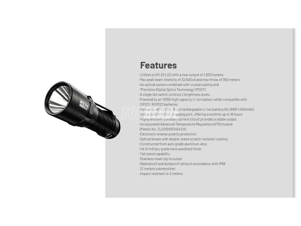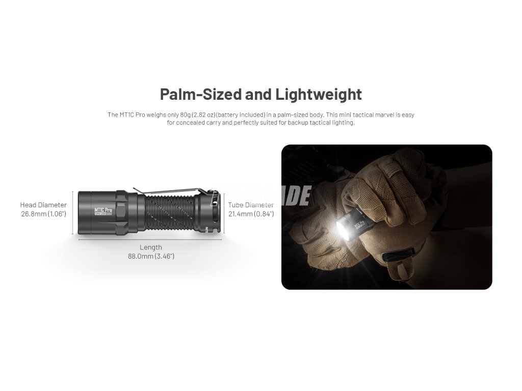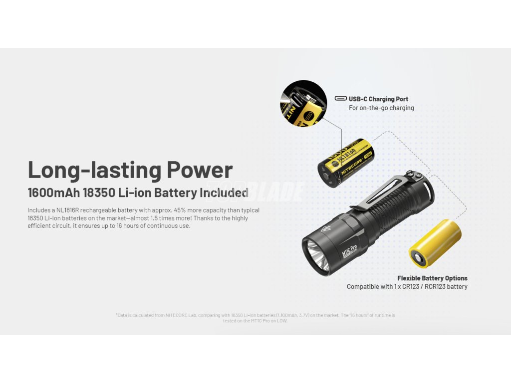 Die Nitecore MT1C Pro ist eine kleine aufladbare Taschenlampe für EDC (Every Day Carry) und taktische Anwendung. Die Taschenlampe ist mit einer UHi 20 LED ausgestattet, die eine Lichtleistung von 1000 Lumen und eine Leuchtweite von 360 Metern hat. Gar nicht so schlecht für eine Taschenlampe mit gerade einmal 8,8 cm Länge. Die Lampe wird mit einem 18350 Akku ausgeliefert, aber kann auch mit einer CR123-Batterie benutzt werden,