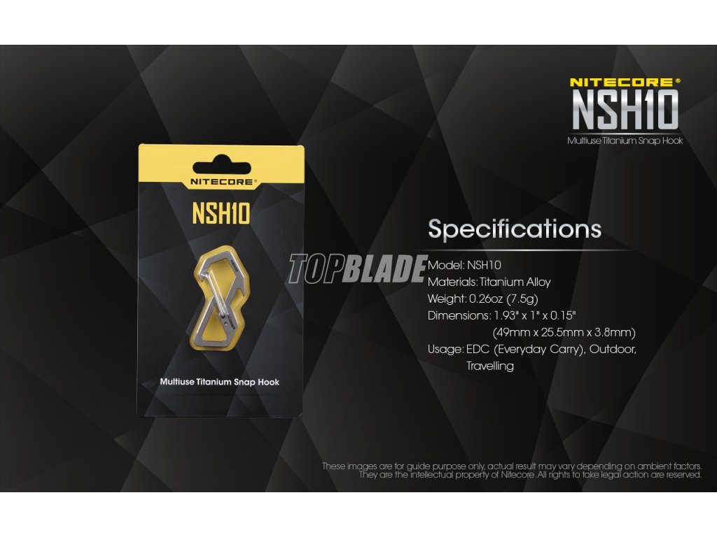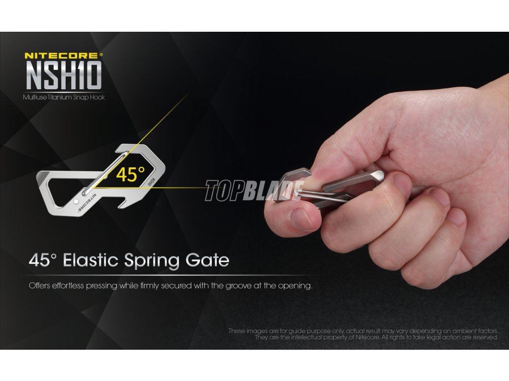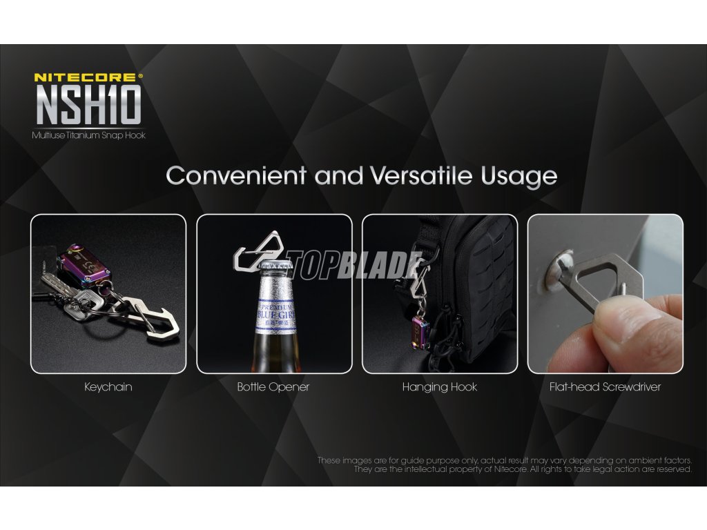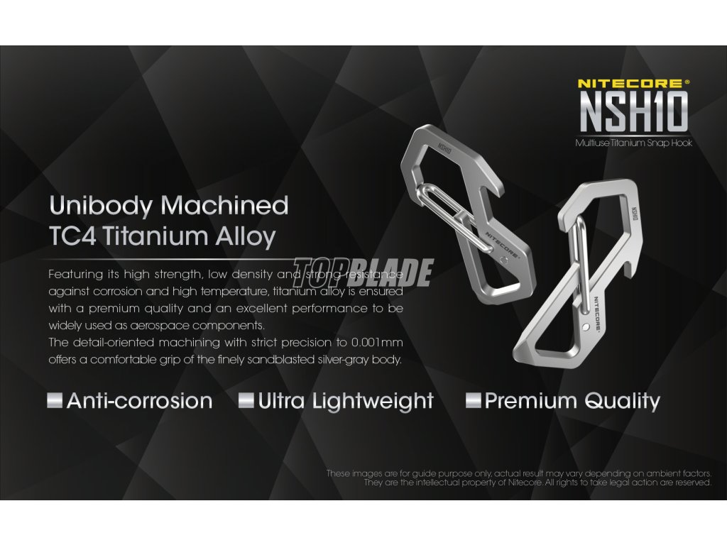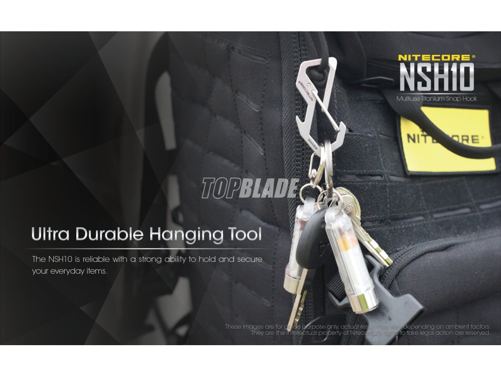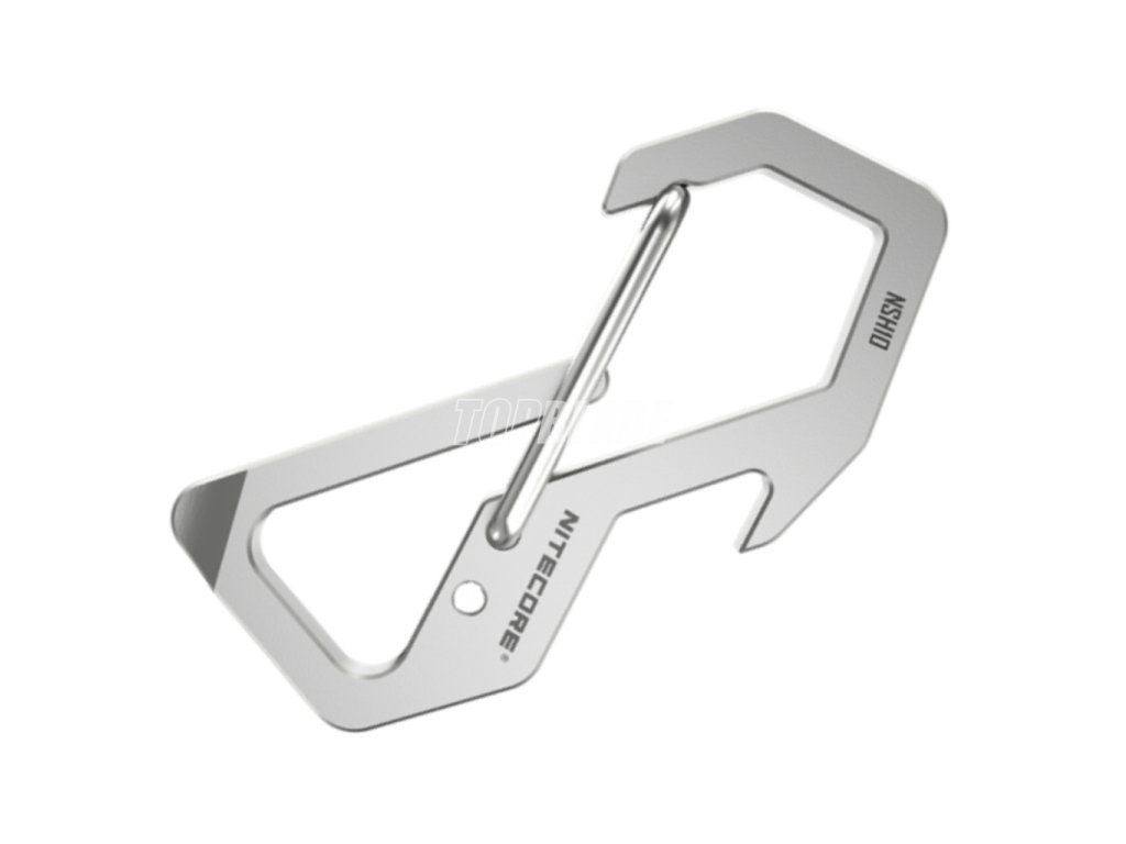 Der Nitecore NSH10 Karabinerhaken ist ideal für den täglichen Gebrauch, Reisen aber auch für das Bushcrafting. Mit diesem Haken kannst Du nämlich nicht nur Schlüssel, sondern auch u.a. Schlüsselbundlampen, Flaschen oder Pouches bei Dir tragen. Außerdem gibt es einen integrierten Flaschenöffner und Schlitzschraubendreher. Den Schraubendreher kannst Du auch als kleines Brecheisen benutzen. Der Karabinerhaken ist aus TC4-Titan gefertigt. Dieser Stahl ist sehr robust, leichtgewichtig und rostfrei.